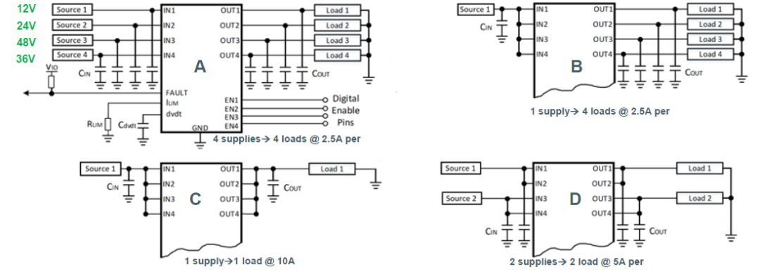 以安森美(onsemi)的eFuse产品为例,其按照功能多少以及是否内置MOSFET划分成了四大类别,以适应不同的功能需求和电流大小需求。通常高电流的通道需要选择外置MOSFET方案,低于30A的电流通道可以根据功能的需求在内置MOSFET方案中选择最适合的一类。